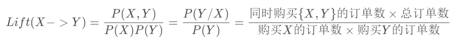 表示购买X的订单中同时购买Y的比例,即同时购买X和Y的订单数占购买X的订单的比例。公式表达: